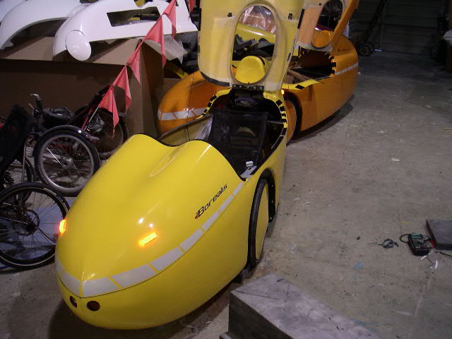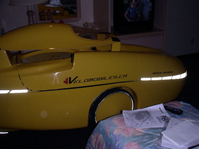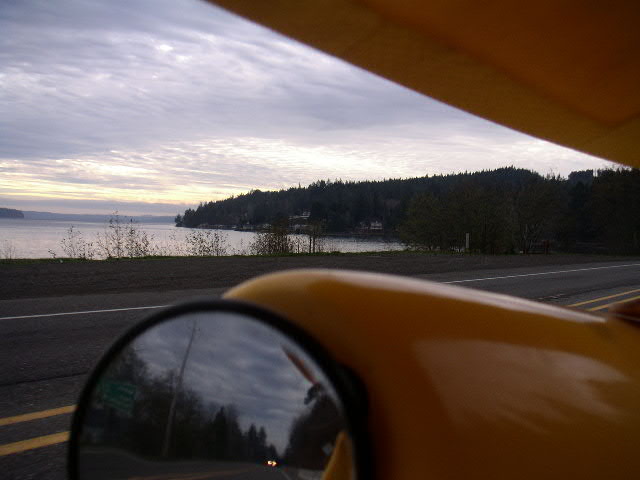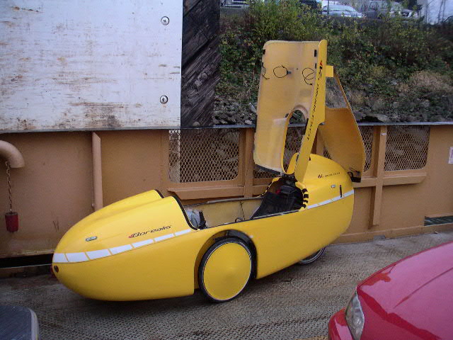 The alarm was a rude awakening at 6am, but time for breakfast and then heading back to the shop before 7, all ready to go. But unfortunately Tim didn’t have the lights ready yet. I was eventually able to leave a bit before 9am, with the first thing being a short ferry ride over the river. Then it was off into the morning traffic heading towards the border. Here I parked outside and went in to be processed – all the staff loved the bike, but the guy checking my passport was either being a smart-ass or was taking things far too seriously. Upon obtaining my occupation as a mechanical engineer he asked me to name two of Newton’s three laws in order to prove it! Once I had passed this test I was back on the road to pick my way South towards Bellingham; somewhere along the way I got off my route (and hence my map) and ended up just following I5 as best as the back roads allowed. Some of these were very rough, which made for noisy, slow going. At one point a truck driver passed me, then stopped ahead to flag me down and ask about the bike – handily I was able to ask for directions for the best route through town too. I got through town and back on route, but then I came to signs announcing a road closure and a diversion. Not being sure what to do – I’ve found in the past that sometimes cyclists can get through road works, but this was five miles ahead so I couldn’t tell – I asked a passing walker who informed me that there had been a big road slip and there wasn’t a way through – I would have to follow the diversion. Which went up. And up. And up some more…. And then, as always tends to happen, a junction and no more diversion signs. I took a couple of educated guesses before catching two cyclists who fortunately were able to furnish me with details to get back on track. Having started two hours late, I was just pushing on with no real stops except for bladder relief and route finding; I had a supply of energy bars to keep the fuel levels up. Rt20, when I got to it, was busy and had a good shoulder. But going over a bridge, I was unable to miss a brick in the road – missed it with the front wheels but SLAM! The rear wheel nailed it at over 30mph. I felt sure I must have at least flatted, if not totaled the rim – but incredibly the suspension took the sting out and all was fine. The bike handles nicely, very stable, although gusty crosswinds on the downhills make it twitch a bit. Then more road works! And a special bike diversion – fortunately this time with great signing. Beautiful views across the ocean and islands, and one very steep climb that required the granny gear for the first time – the chain promptly dropped all the way off, but not too big a deal on a trike! I finally got to the ferry after seven hours and 120 miles, just before the light faded completely. I had an hour to wait, so grabbed some food – with the restaurant having chips actually called chips instead of fries! After the ferry trip, I rolled into Port Townsend and found a motel and the grocery store. The Borealis just fit through the door, and I was ready for some sleep….> Saturday 6th December